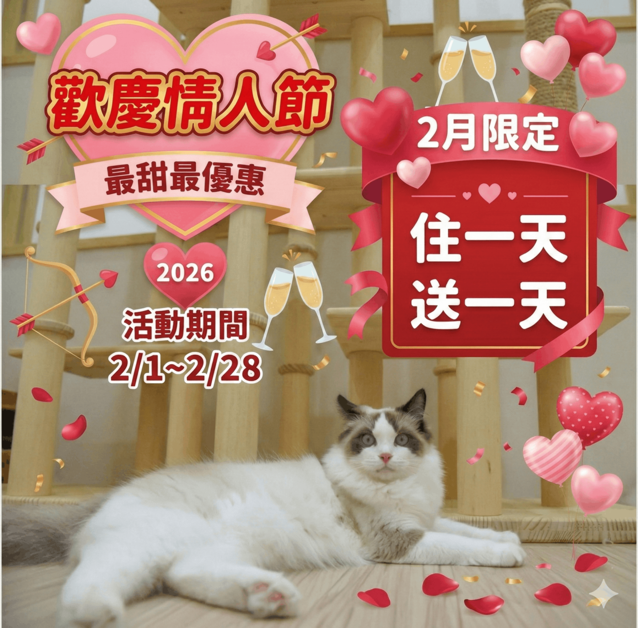 可入住1~3隻貓,第2隻起每隻加收 NT$200/日
